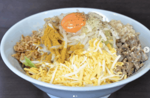 カレーまぜジロー復活 たっぷりの野菜に刻みチャーシュー、カレースパイスの香りが食欲をそそります✨カレーのスパイシーさとガツンと来るまぜそばのうまみをご堪能ください。お好みでチーズのトッピングもおすすめです!!
